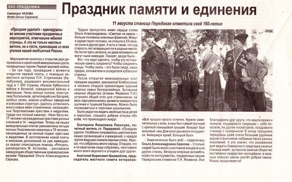 | Газета "Сельская жизнь" Отрадненского района от 16.08.2018г. №_ (_), стр. 3. Рубрика "Эхо праздника". "Праздник памяти и единения. 11 августа станица Передовая отметила своё 160-летие". Автор С.Чазова. Фото О. Серковой. Рассказ о впечатлениях от праздника.